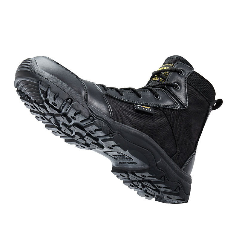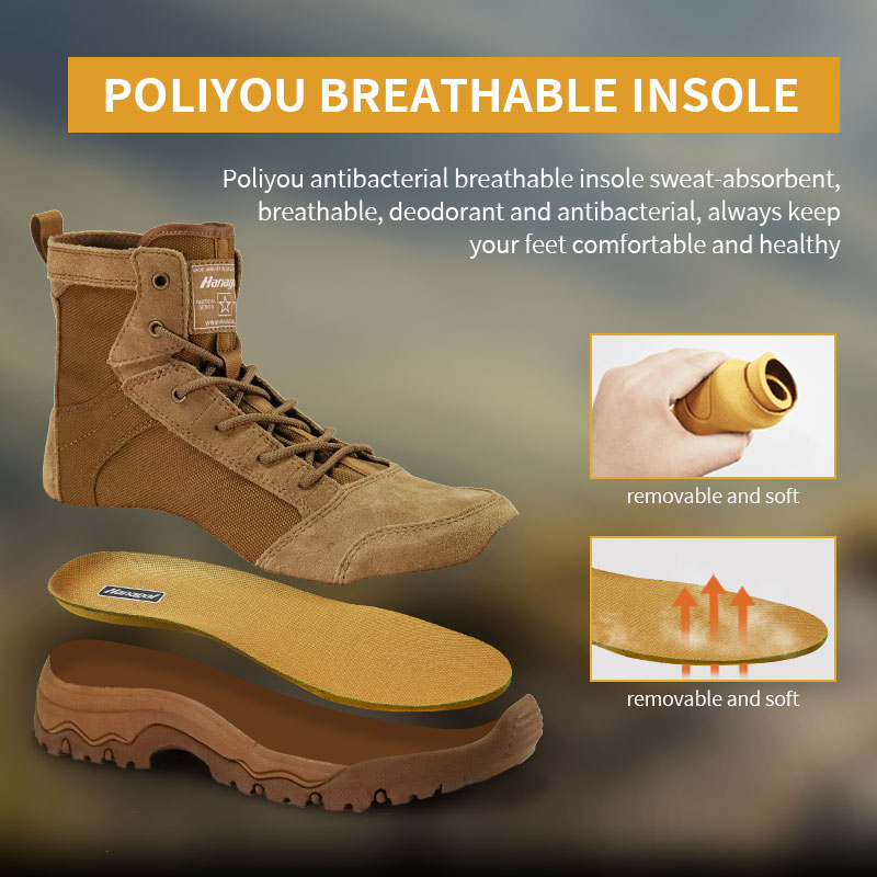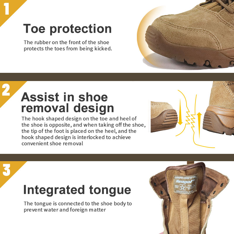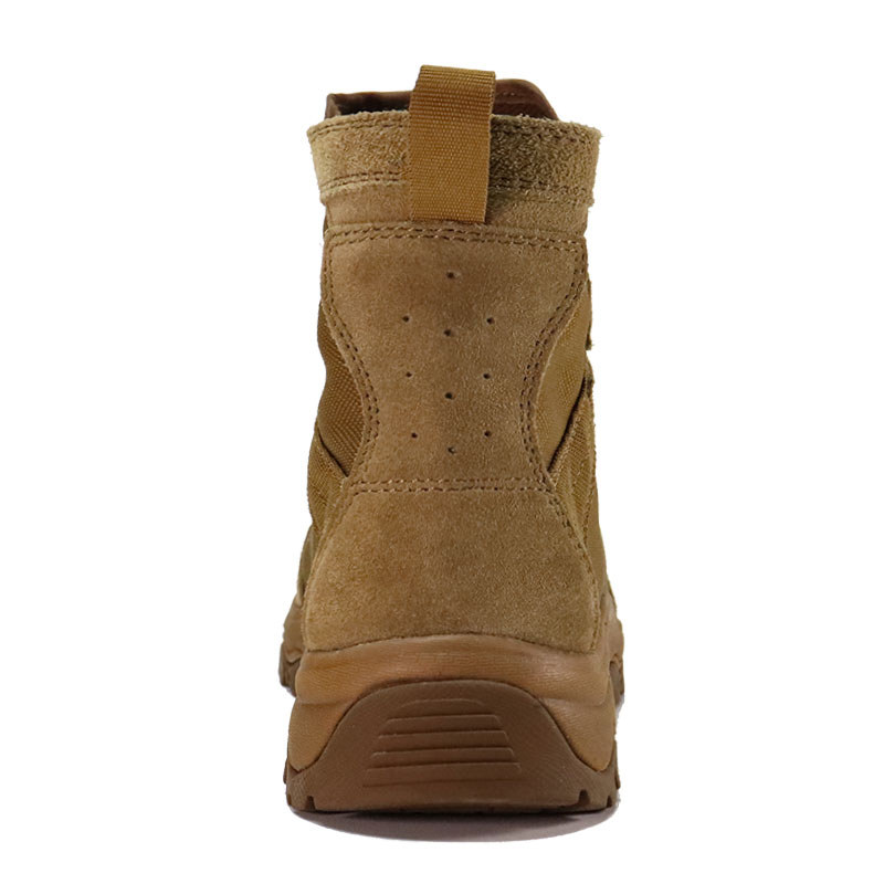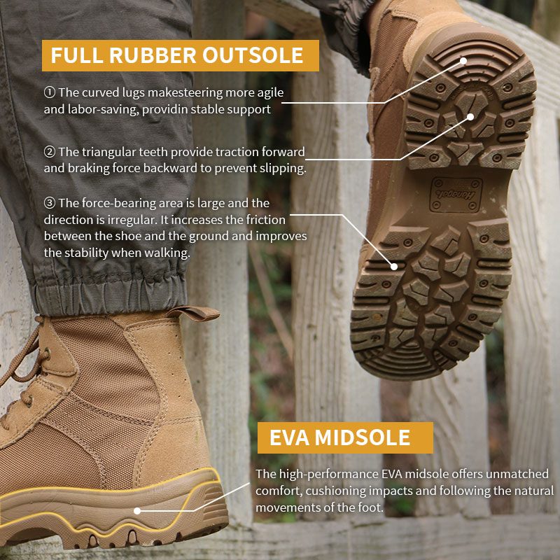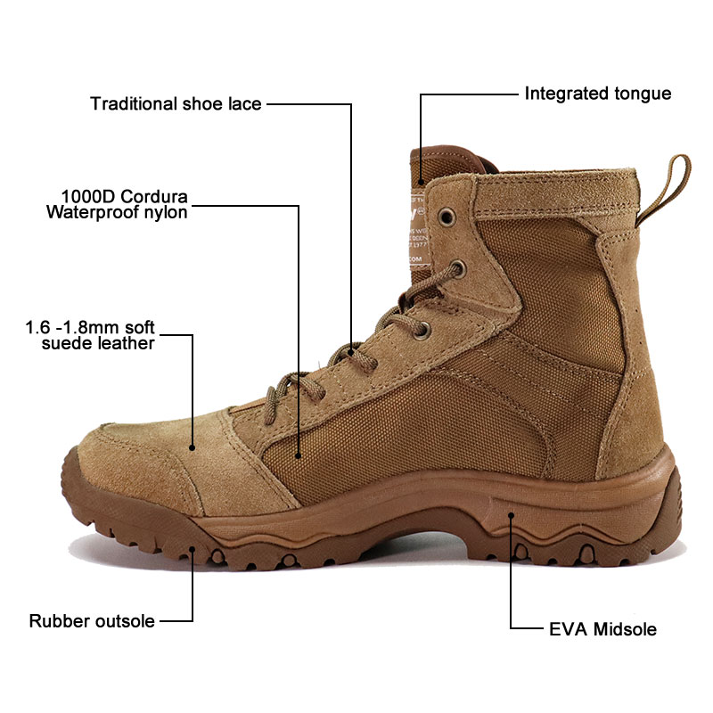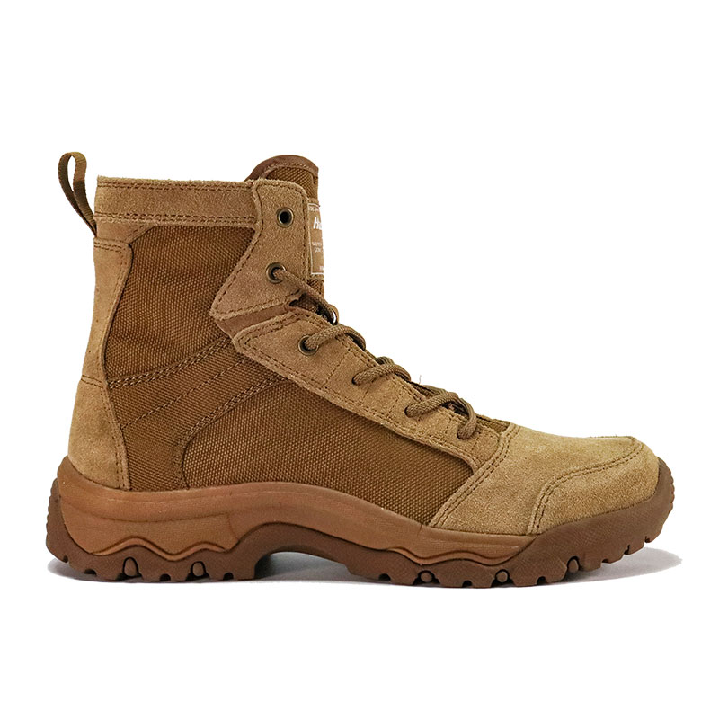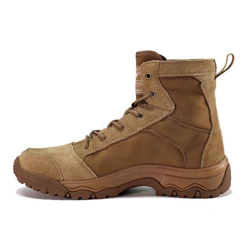 కష్టతరమైన భూభాగం కోసం రూపొందించబడిన, Cordura ఫాబ్రిక్ రబ్బర్ ఎడారి వ్యూహాత్మక బూట్లు తేలికైన సౌకర్యాన్ని మరియు తీవ్రమైన స్థిరత్వాన్ని అందిస్తాయి-కాబట్టి మీరు రాక్, ఇసుక మరియు మధ్యలో ఉన్న ప్రతిదానిపై నమ్మకంతో కదలవచ్చు. కోర్డురా పైభాగం రాపిడికి గురవుతుంది మరియు శిధిలాలను మైలుకు మైలు దూరం ఉంచుతుంది. పాదాల కింద, అధిక-పనితీరు గల EVA మిడ్సోల్ ప్రతి స్ట్రైక్ను కుషన్ చేస్తుంది మరియు మీ స్ట్రైడ్తో సహజంగా కదులుతుంది. మరియు రబ్బరు అవుట్సోల్? ఇది వదులుగా ఉండే నేల మరియు కఠినమైన మార్గాలను ఒకేలా పట్టుకుంటుంది-అనుకూలంగా నిర్మించబడింది, చివరిగా నిర్మించబడింది.