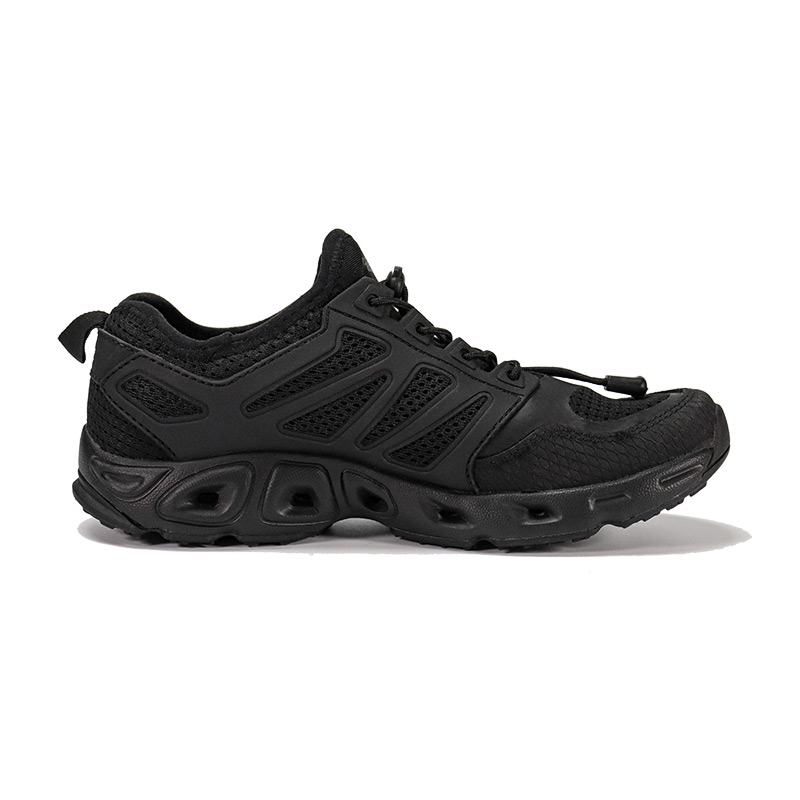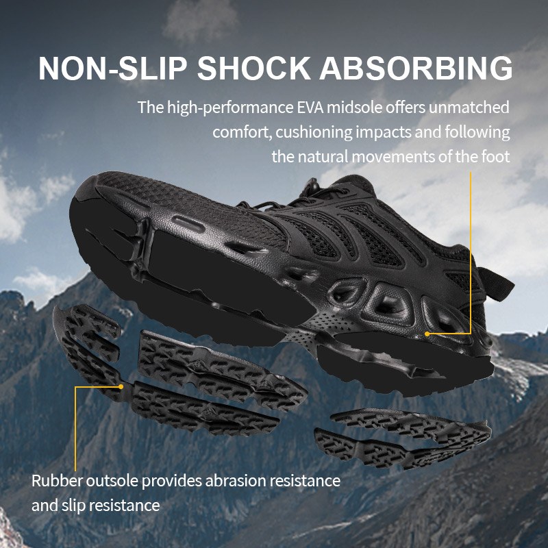 EVA షాక్ అబ్సార్బింగ్ ట్రెక్కింగ్ షూస్ ట్రయల్-తడి లేదా పొడి కోసం నిర్మించబడింది. త్వరిత-ఆరబెట్టే పదార్థాలు మరియు వంపులో డ్రైనేజ్ పోర్టులతో, మీరు ప్రవాహం నుండి శిఖరానికి వెళ్లినప్పుడు అది నీటిని వేగంగా చిమ్ముతుంది. ఒక రబ్బరు హీల్ ప్యాచ్ స్థిరత్వాన్ని లాక్ చేస్తుంది, అయితే EVA మిడ్సోల్ పాదాల కింద మృదువైన, షాక్-శోషక సౌకర్యాన్ని అందిస్తుంది. మరియు కఠినమైన రబ్బరు అవుట్సోల్? రాతి, మట్టి, వదులుగా ఉండే కంకర వంటి దేనినైనా పట్టుకునేలా నిర్మించబడింది. ఇది ఉభయచరమైనది, చురుకైనది మరియు మీతో పాటు కదలడానికి నిర్మించబడింది.