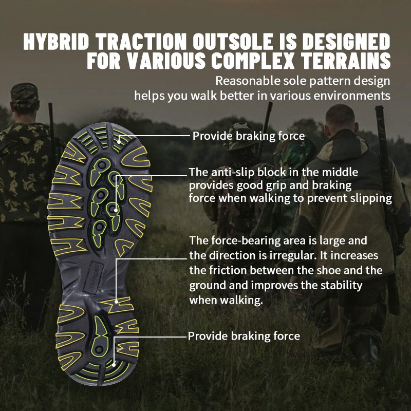 ①Poliyou హై-స్ట్రెచ్ తేమ-వికింగ్ ఇన్సోల్ ఇంటీరియర్ డ్రైగా ఉంచుతుంది. ②EVA మిడ్సోల్, మభ్యపెట్టే వస్త్రంతో చుట్టబడి, కుషనింగ్ మరియు షాక్ అబ్జార్ప్షన్. ③మన్నికైన రబ్బరు అవుట్సోల్, నాన్-స్లిప్ మరియు వేర్-రెసిస్టెంట్.
